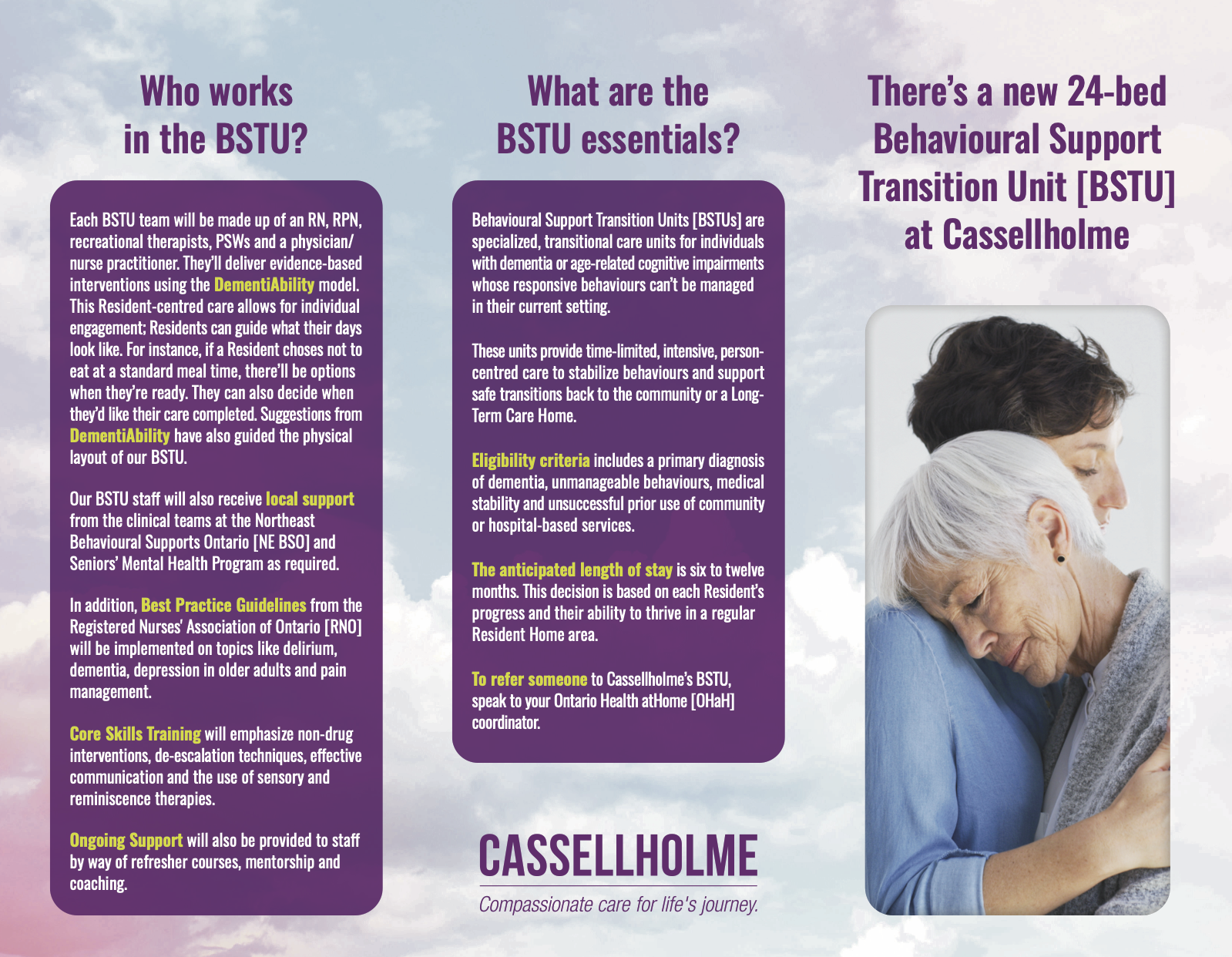 BSTUs are specialized, transitional care units for individuals with dementia or age-related cognitive impairments whose responsive behaviours can’t be managed in their current setting. These units provide time-limited, intensive, person-centred care to stabilize behaviours and support safe transitions back to the community or to their Long-Term Care Home [LTC].